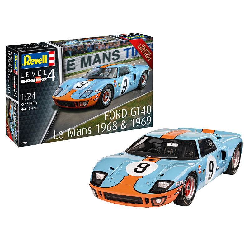 La Ford GT40 est une voiture de sport du constructeur américain Ford fabriquée à 126 exemplaires, de 1964 à 1968. Elle a permis à la firme américaine de remporter, notamment, les 24 Heures du Mans quatre années successives, de 1966 à 1969 .La maquette voiture Revell au 1/24 propose une reproduction du modèle de 1968 ou 1969 et se compose de 96 pièces, réf: 07696