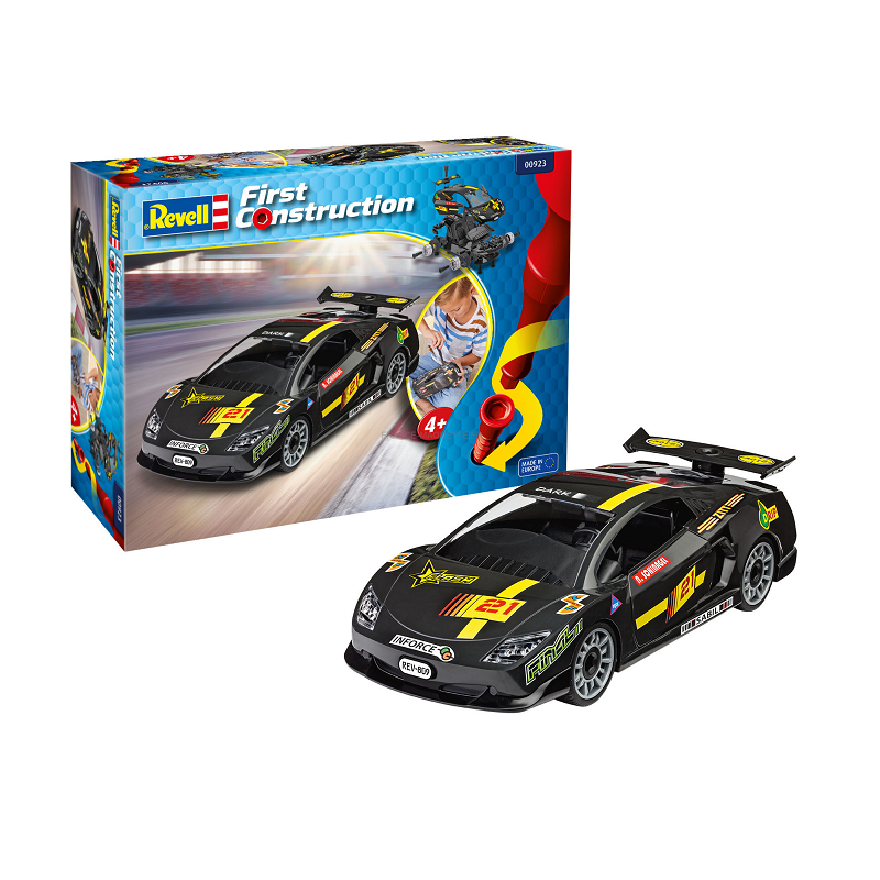 Cette maquette voiture Revell représente une voiture de course noire. Il s'agit d'une maquette "First Construction" pour initier les débutants à partir de 4 ans. Elle est composée de 21 grosses pièces robustes à assembler à l'aide de vis et d'un tournevis fournis, réf : 00923