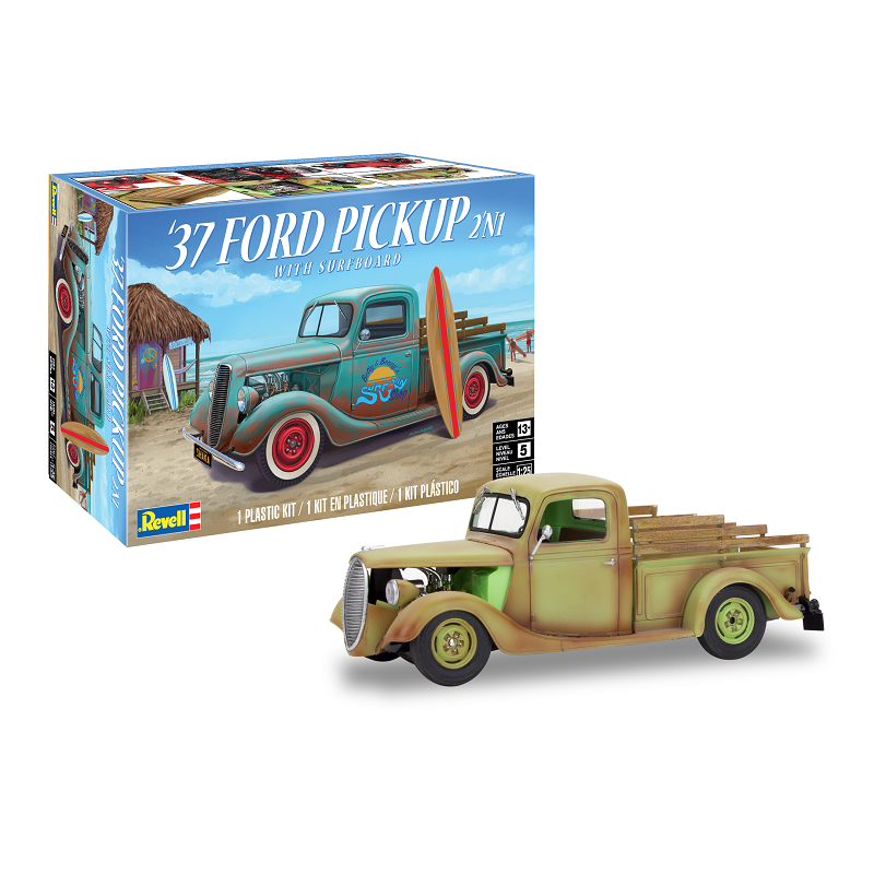 Cette maquette voiture Revell au 1/25 propose un pick-up Ford de 1937 avec son surf, réf: 85-4516