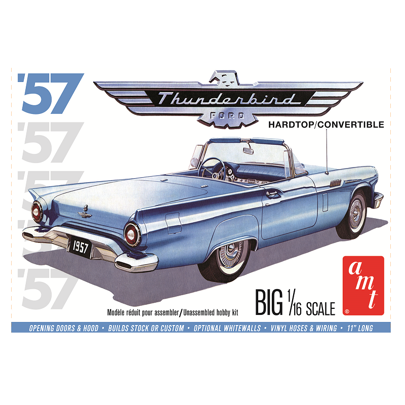 La Ford Thunderbird, communément appelée « T-Bird », est une voiture produite par le constructeur américain Ford. A l'origine, en 1955, il s'agit d'un modèle « sport » à deux places conçu pour concurrencer la Chevrolet Corvette sortie en 1953, mais la Thunderbird finira par devenir une voiture de luxe sur le créneau de la Cadillac Eldorado. La maquette voiture AMT au 1/16 propose le modèle 1957 en version décapotable, réf: 1206