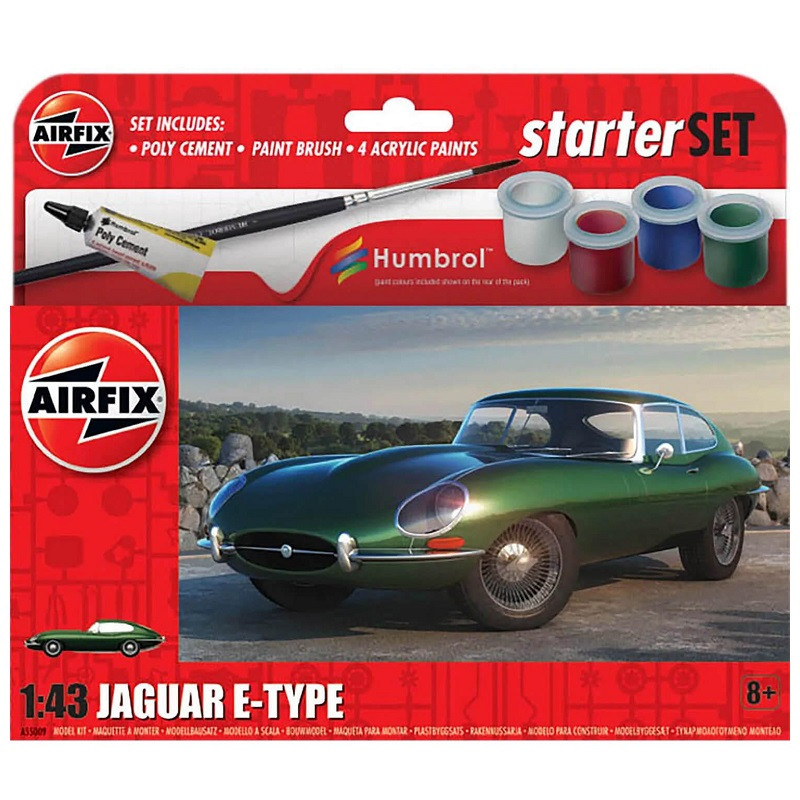 La Jaguar Type E est une voiture de sport fabriquée par le constructeur automobile britannique Jaguar dans les années 1960 et 1970. Présentée au Salon international de lautomobile de Genève de 1961, elle succède à la série des XK. La production sétend de 1961 à 1975 et se décline en trois modèles (cabriolet, coupé et 2+2). La maquette voiture Airfix au 1/43 est un « Starter Set » contenant colle, peintures et pinceaux, réf : 55009