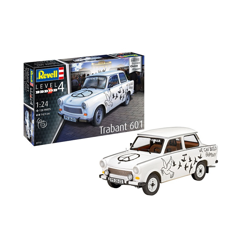 La Trabant 601 est une automobile fabriquée entre 1964 et 1990 par l'entreprise d'État est-allemande VEB Sachsenring Automobilwerk Zwickau (AWZ). Symbole de la faillite de la République démocratique allemande, la Trabant est aujourd'hui une voiture culte en Allemagne, au même titre que la Coccinelle, la Mini ou encore la 2CV. La maquette Revell au 1/24 propose une reproduction détaillée de ce modèle, réf: 07713
