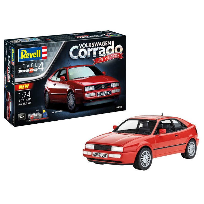 La Corrado est un coupé sportif du constructeur automobile allemand Volkswagen produit de 1988 à 1995. Ce kit maquette voiture Revell au 1/24 est un coffret cadeau édité pour le 35ème anniversaire de ce modèle, il contient la colle, le pinceau et les peintures nécessaires à sa réalisation, réf : 05666